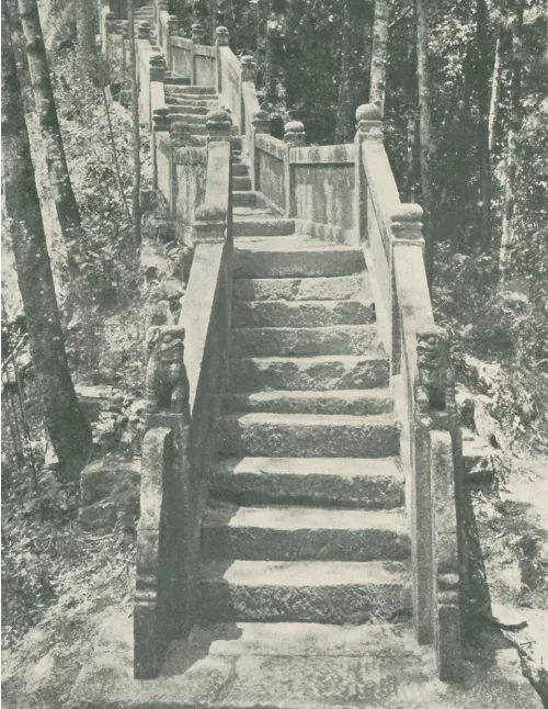 这座花园也是通向位于山崖顶端最重要的殿宇的必经之路。上山沿途有许多用石头或木头建成的小型殿宇,构造不一,有六角屋顶、四角屋顶、圆顶,用砖瓦或稻草遮盖。沿路向上走经过斜坡,登上陡峭的层层石阶,终于到达山顶上的空地,这里就是神人黄石公为张良授书之地。为了纪念此事,这座两层高的殿宇取名为“授书楼”。