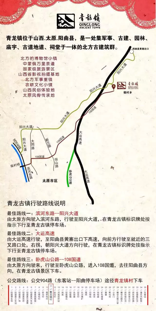 青龙古镇位于山西省阳曲县与尖草坪区相邻的侯村乡,该村紧傍208国道、北同蒲铁路和大运高速公路,交通极为便利。全村总面积235万平方米,其中耕地面积3500亩,户数500户,人口1400人。