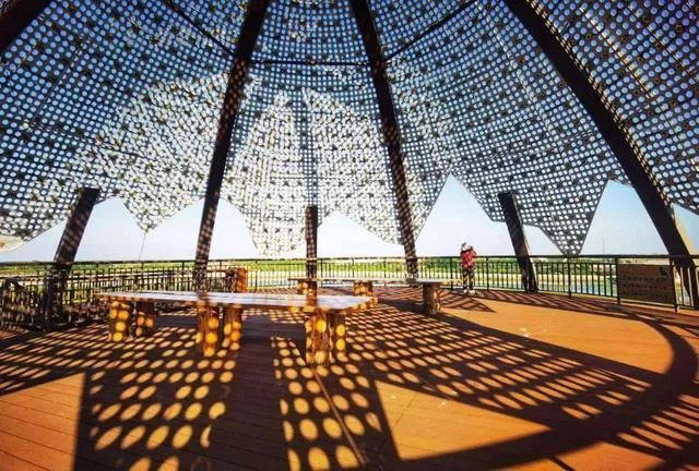 这个大鸟蛋观景台里好漂亮,午后的阳光透过沙窗一样的蛋壳顶照射下来,斑驳而又富有韵律,极有构成的美感,太喜欢这样的感觉了,我和朋友把这里当成摄影棚狂拍。