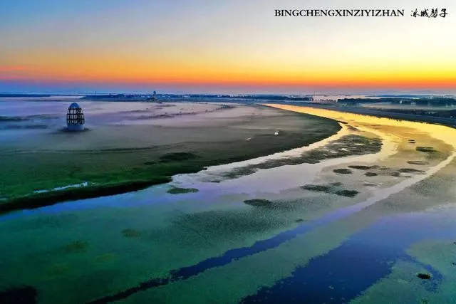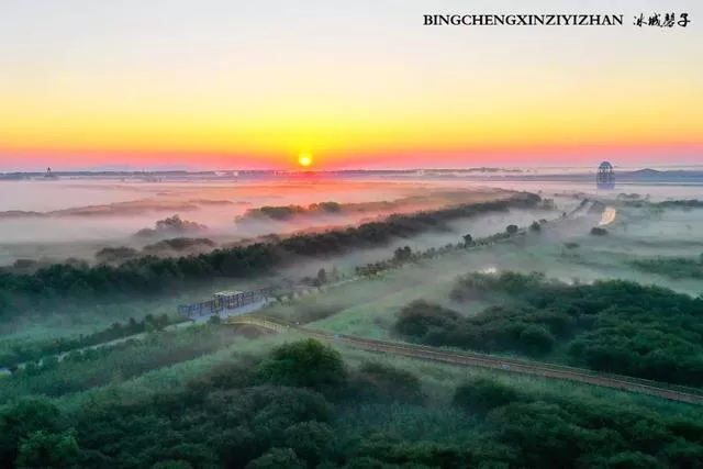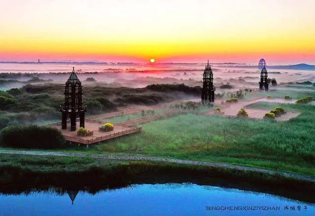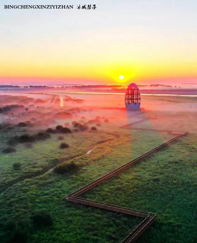 清晨里雾蒙蒙的三江口湿地非常的美,三座铁塔并肩而立映着日出,形成了一幅绚丽的画面。