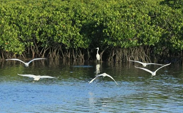 下午,树根露出水面,有好多彩色的小螃蟹在欢快的爬来爬去。你还会看见各种各样的鱼类,有鳗鲡、石斑鱼、鲈鲷鱼等等。你还会看到一群白鹭在远方浅水处抓鱼。