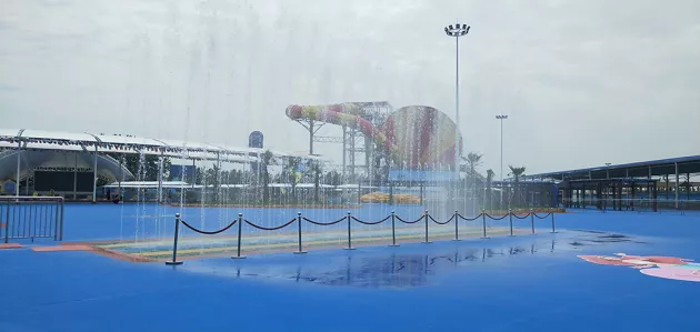 旱地喷泉位于水上乐园正门附近,当音乐想起时,水花从地下喷泉涌出在彩灯照射下,地面犹如五颜六色的镜面,将空中飞舞的水花映衬的无比娇艳欢快的水柱此起彼伏,给游客一个地道的"水上乐园式"欢迎。