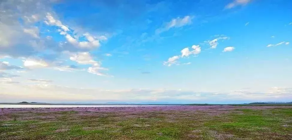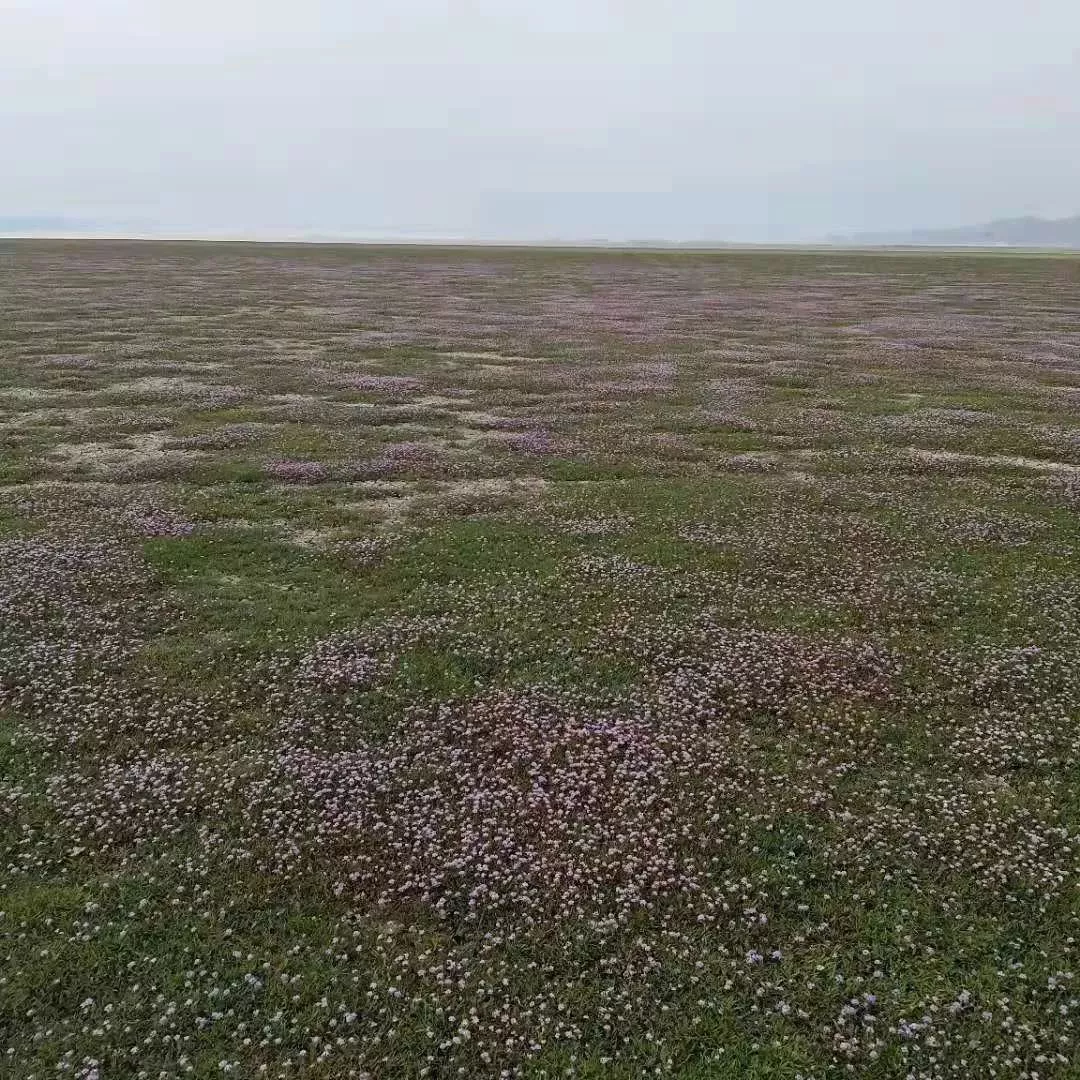枯水季节是一片湖洲,辽阔的洲头,绿草如茵,就象铺上了望不到头的绿色地毯,宽阔的草滩上盛开了无数的小花,一望无际。
