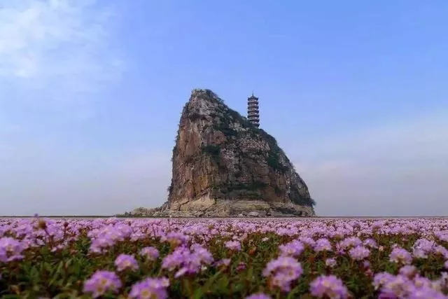 相传朱元璋曾驻足此山,并脱下袍服晾晒,故此而得名。枯水季节是一片湖洲,辽阔的洲头,绿草如茵,就象铺上了望不到头的绿色地毯,宽阔的草滩上盛开了无数的小花,一望无际。