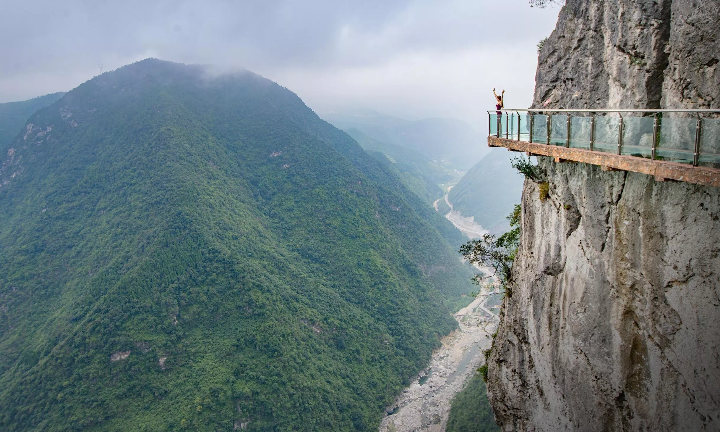 第一站:“连天栈道”体验高度,该景区是2017年7月开业的景区,拥有900米高悬空玻璃栈道,该栈道悬挂于龙河之上,全长3500米,宽1.5米,沿途风景优美,远看群山,近看龙河,来此挑战自我的人数不尽数。无论你是娇小脆弱的小女子,或是女汉子,再或者是彪悍的大叔。来到“连天栈道”一样让你重新认识自己。脚在走,心在抖,这种感觉真的太难描述了,只有真正去体验了你就明白了。有恐高的人,可以拉着石壁的铁链子走,不敢看下面就看看石壁上的壁画也是可以的。