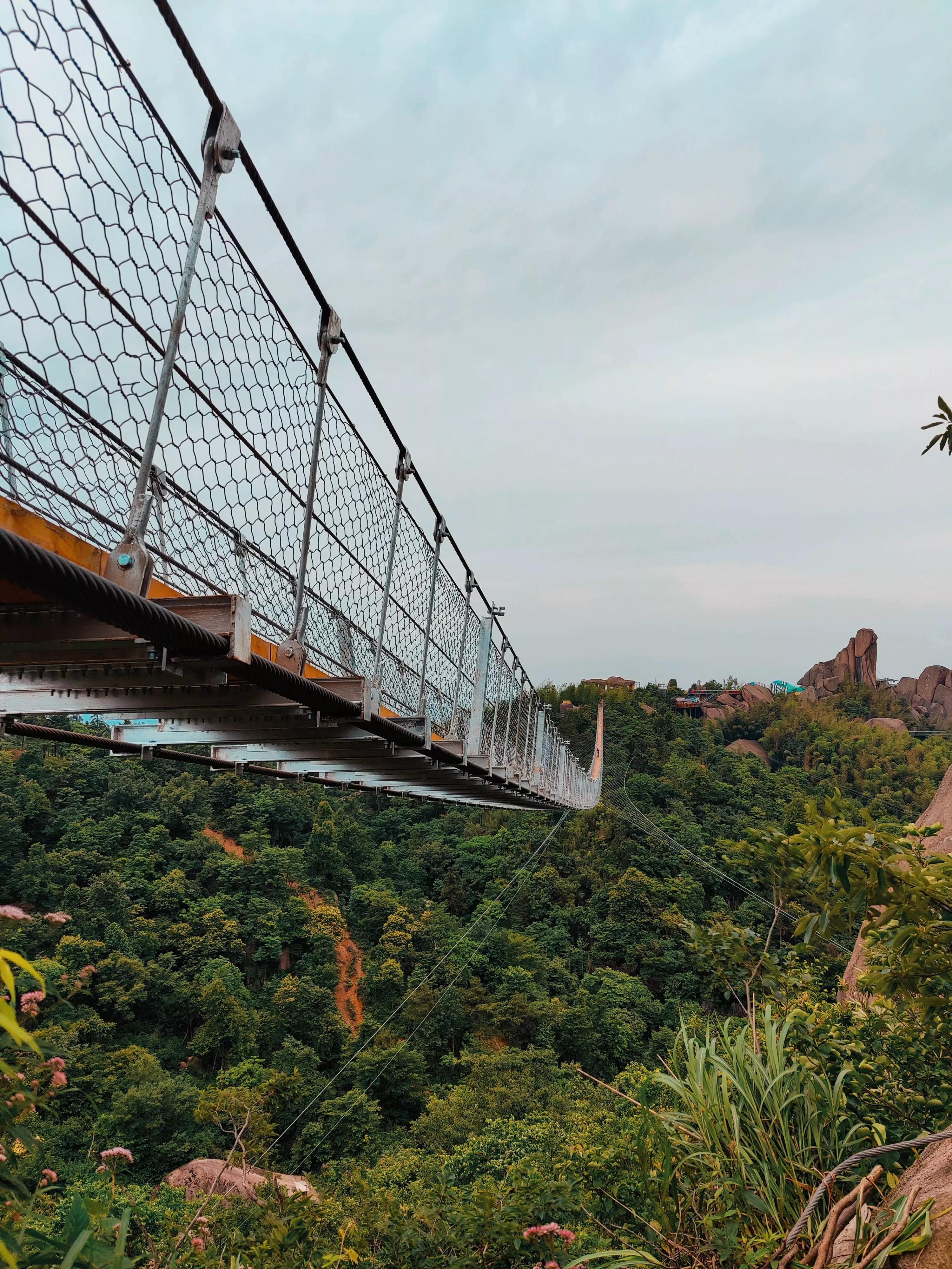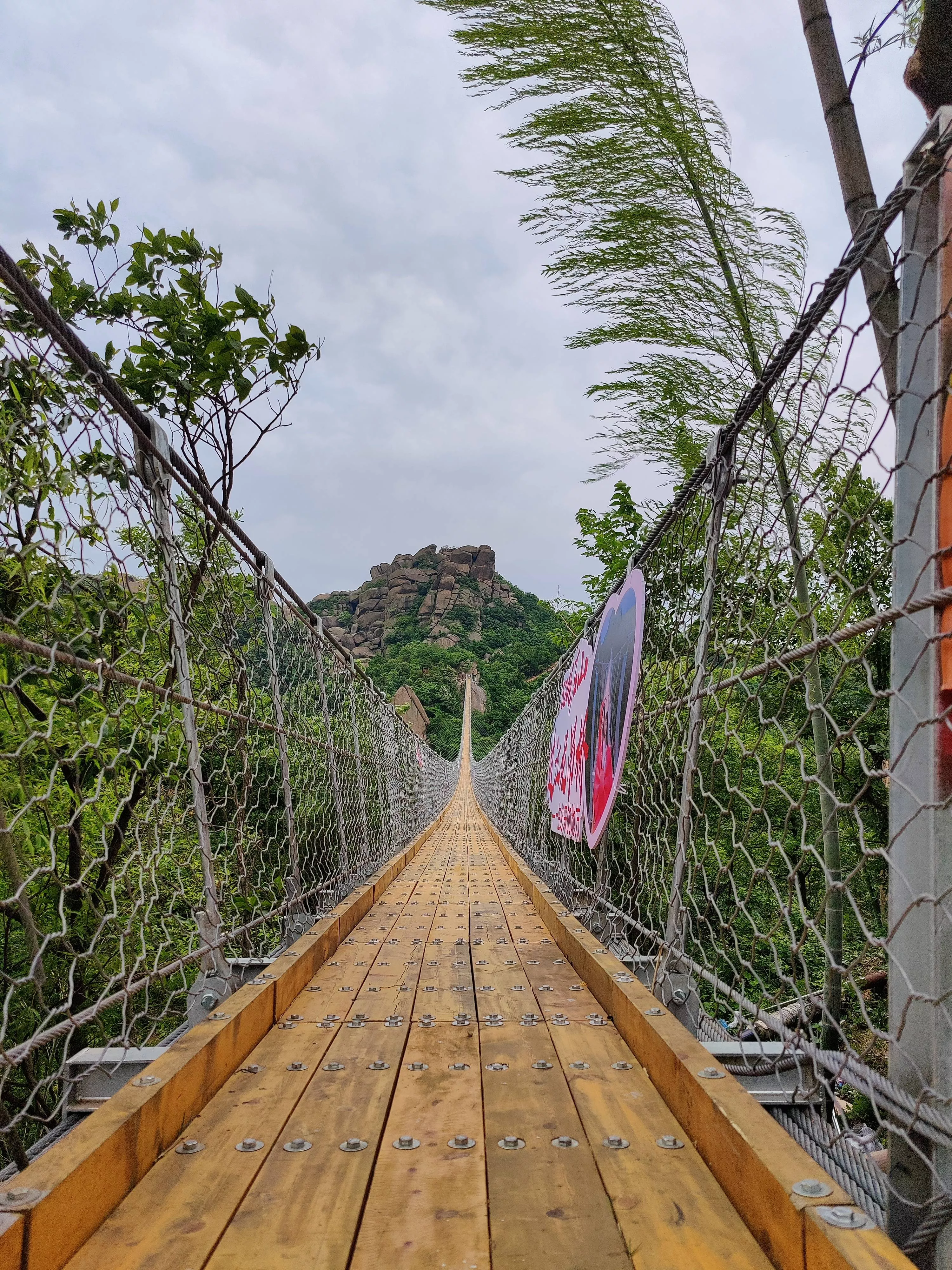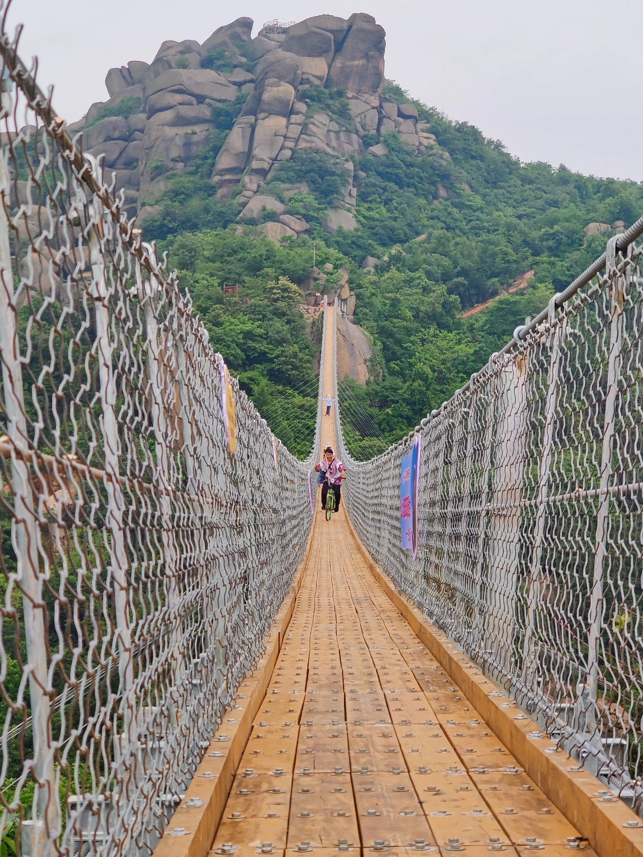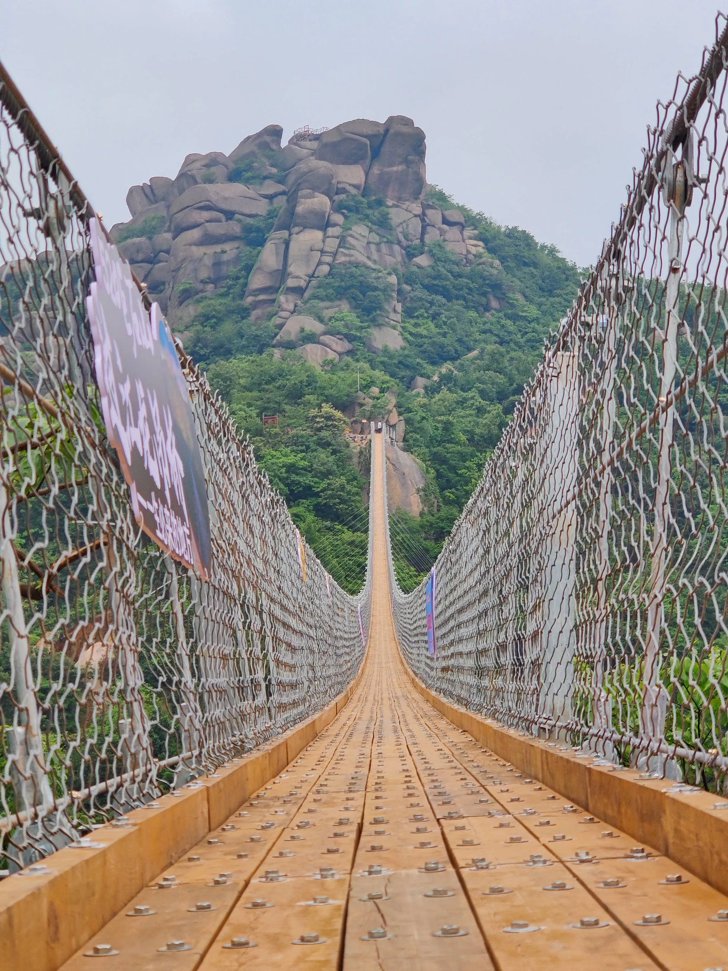 520巨石山过江龙吊桥全长365米,距离地面52米高度的吊桥建在半山之上,自山巅而下,