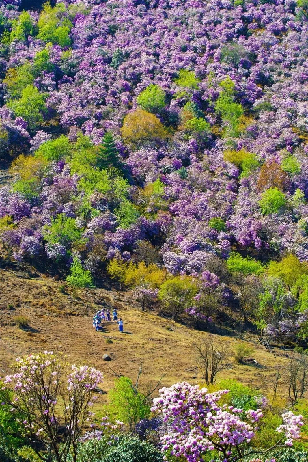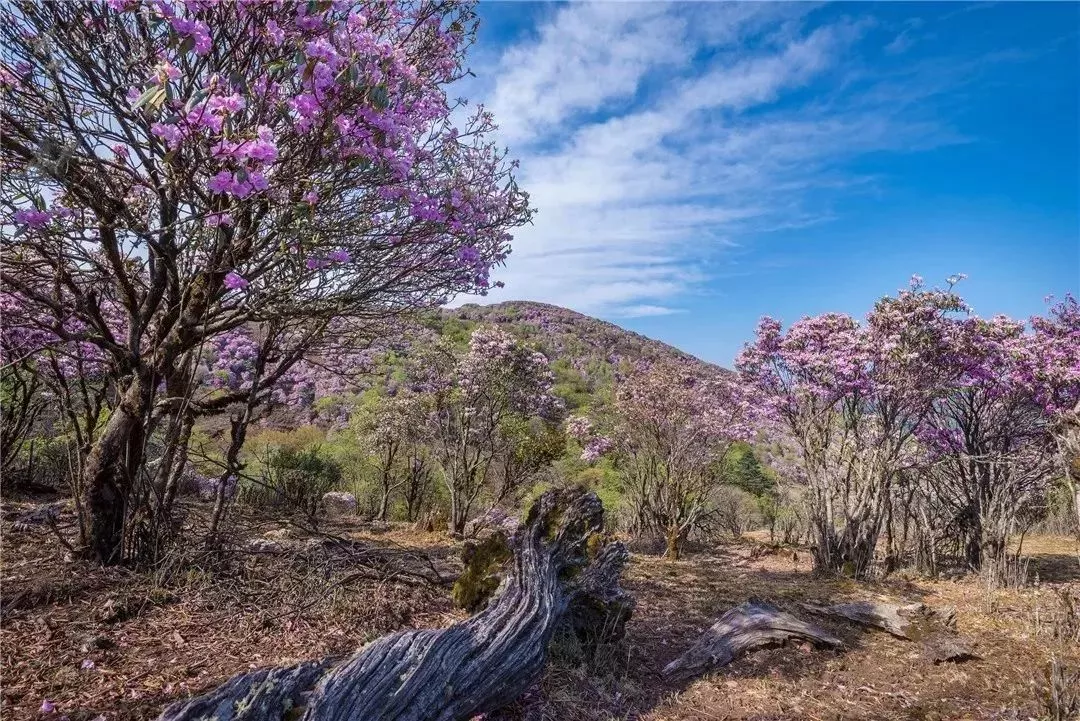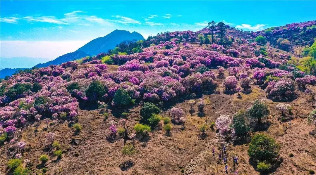 杜鹃开始竞相绽放,千姿百态、色彩缤纷,将连绵的山体装扮得五彩斑斓