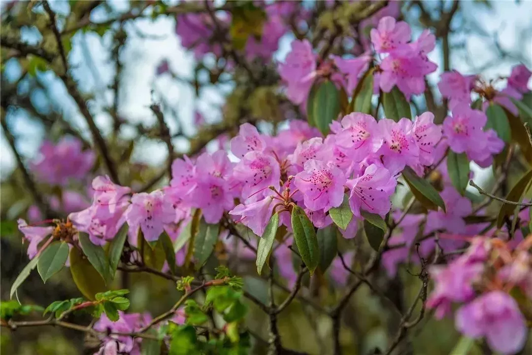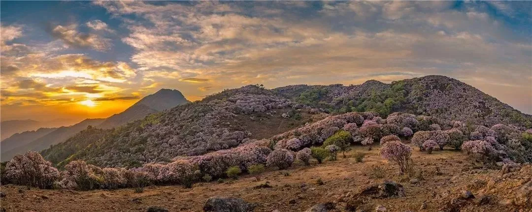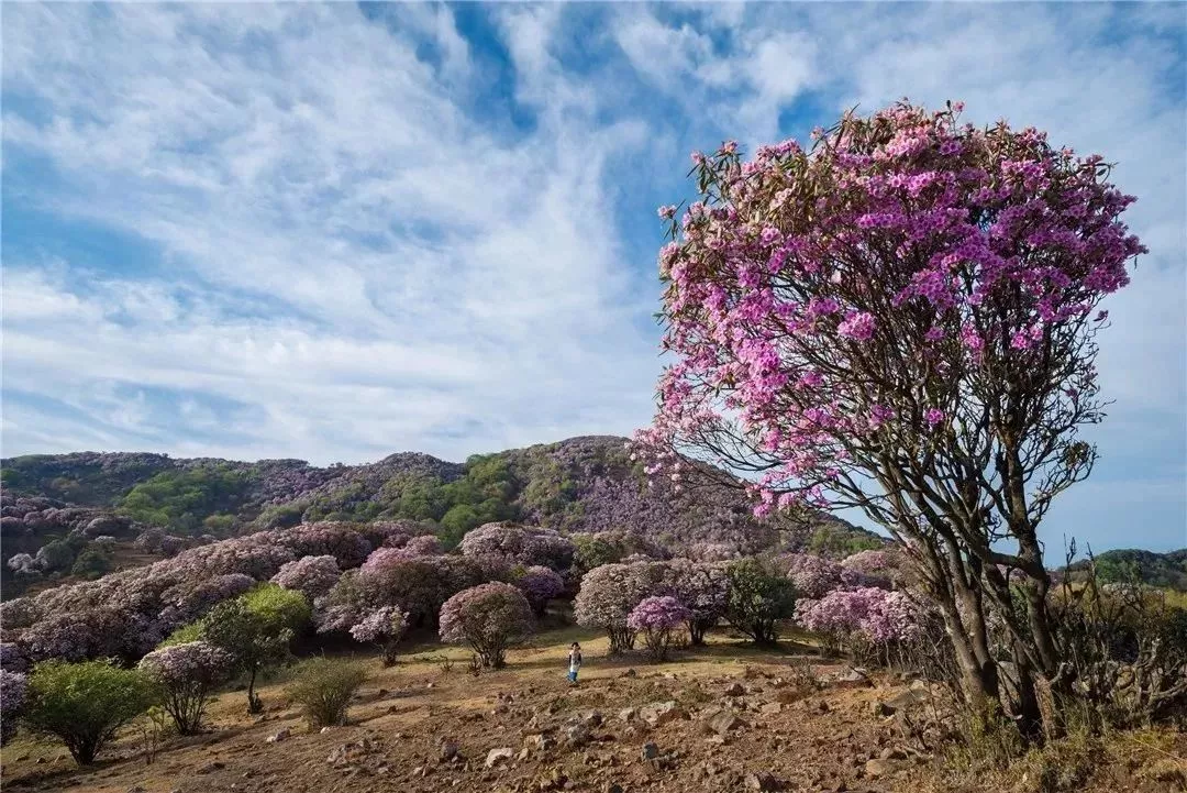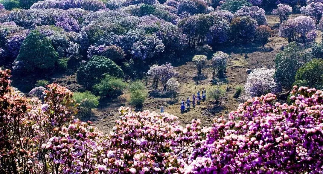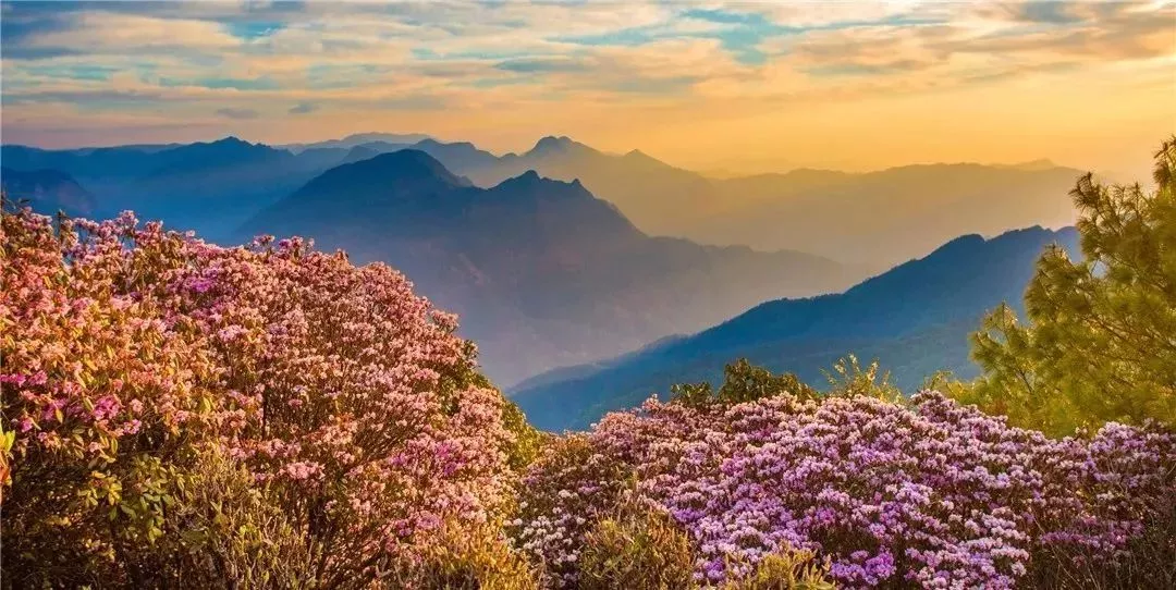 成千上万亩杜鹃,成林连片,色彩斑斓,日起时云蒸霞蔚,日落处蔓延山野。“堆红砌翠”不足以壮其形;“怡红快绿”不足以畅其心。