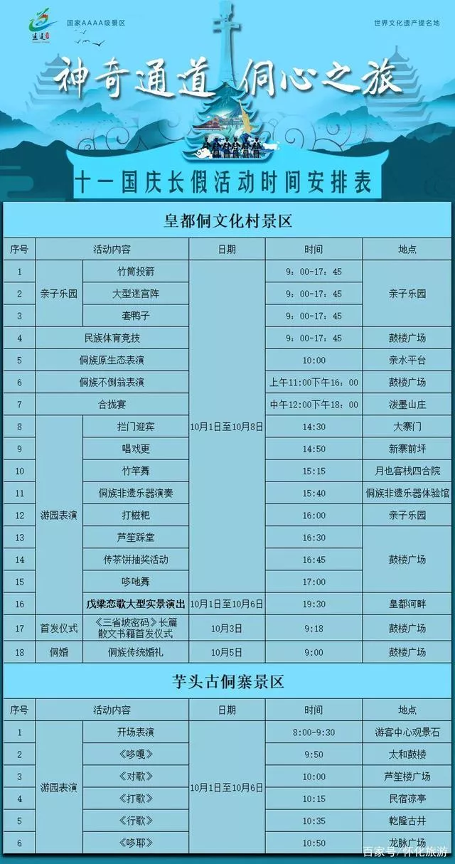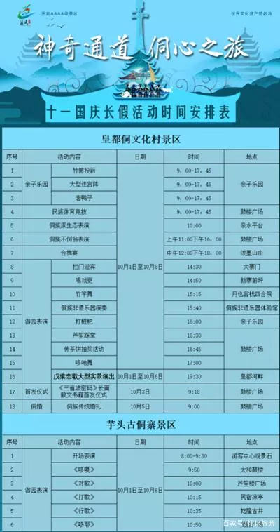 国庆小长假,皇都侗文化村和芋头古侗寨表演安排。景区供图