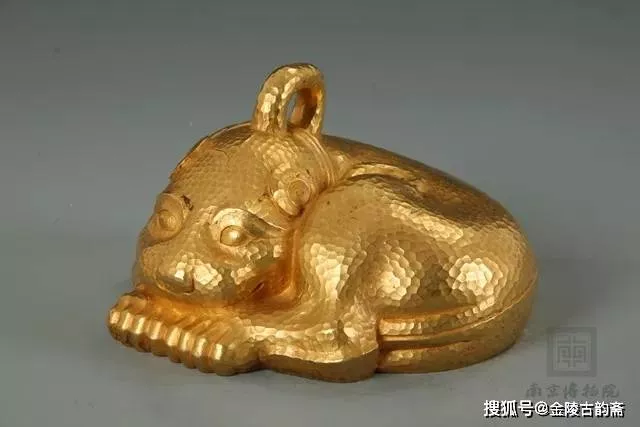 西汉金兽呈趴伏状,外形像一只豹子,头大尾长,眼睛迥然有神,颈部戴三轮项圈,头顶还有一环纽。其全身遍布不规则圆形斑纹,可见是器物整体铸成之后,特意用工具锤击上去的。金兽将古代金属铸造工艺和金器锤击工艺两种技法完美地结合在一起,实属罕见,弥足珍贵。