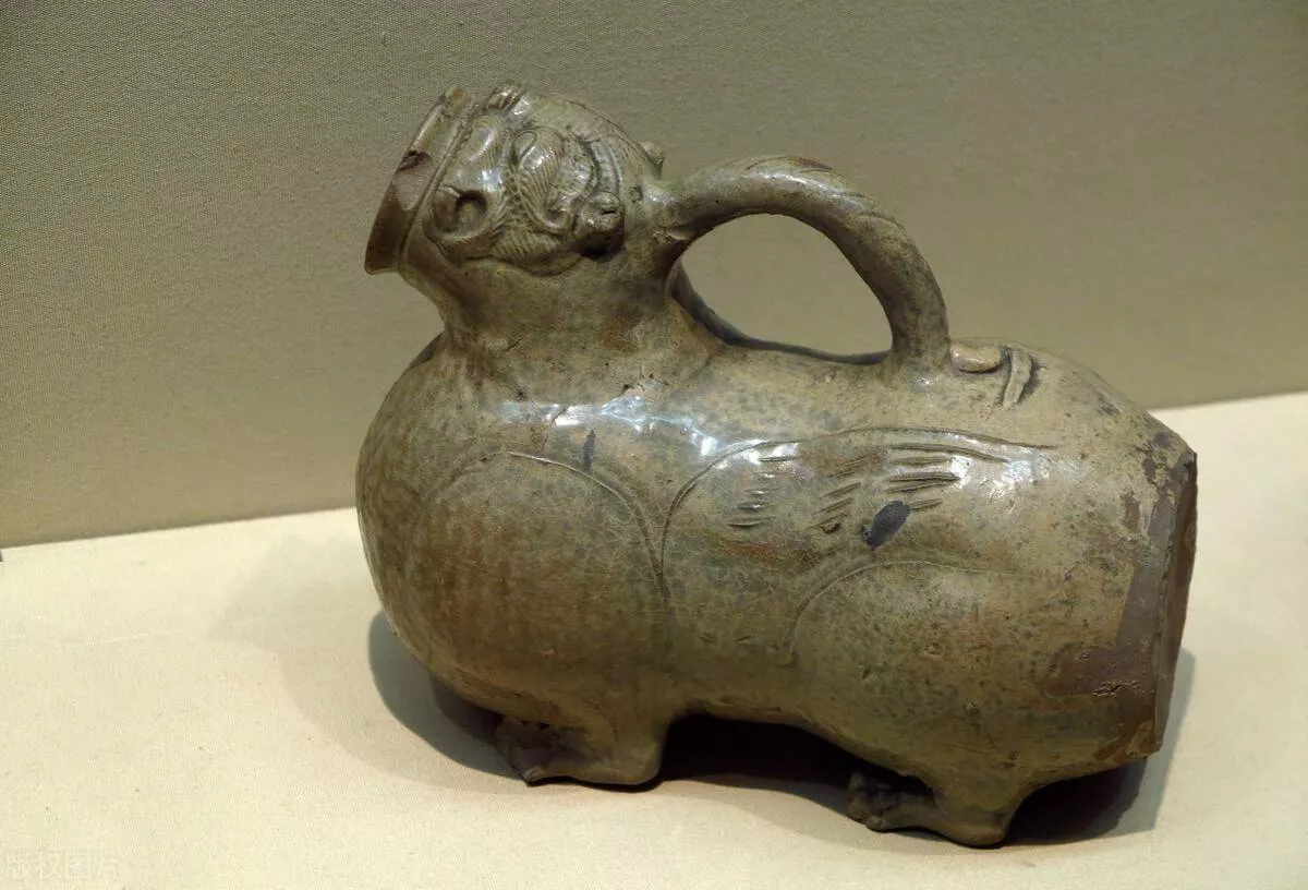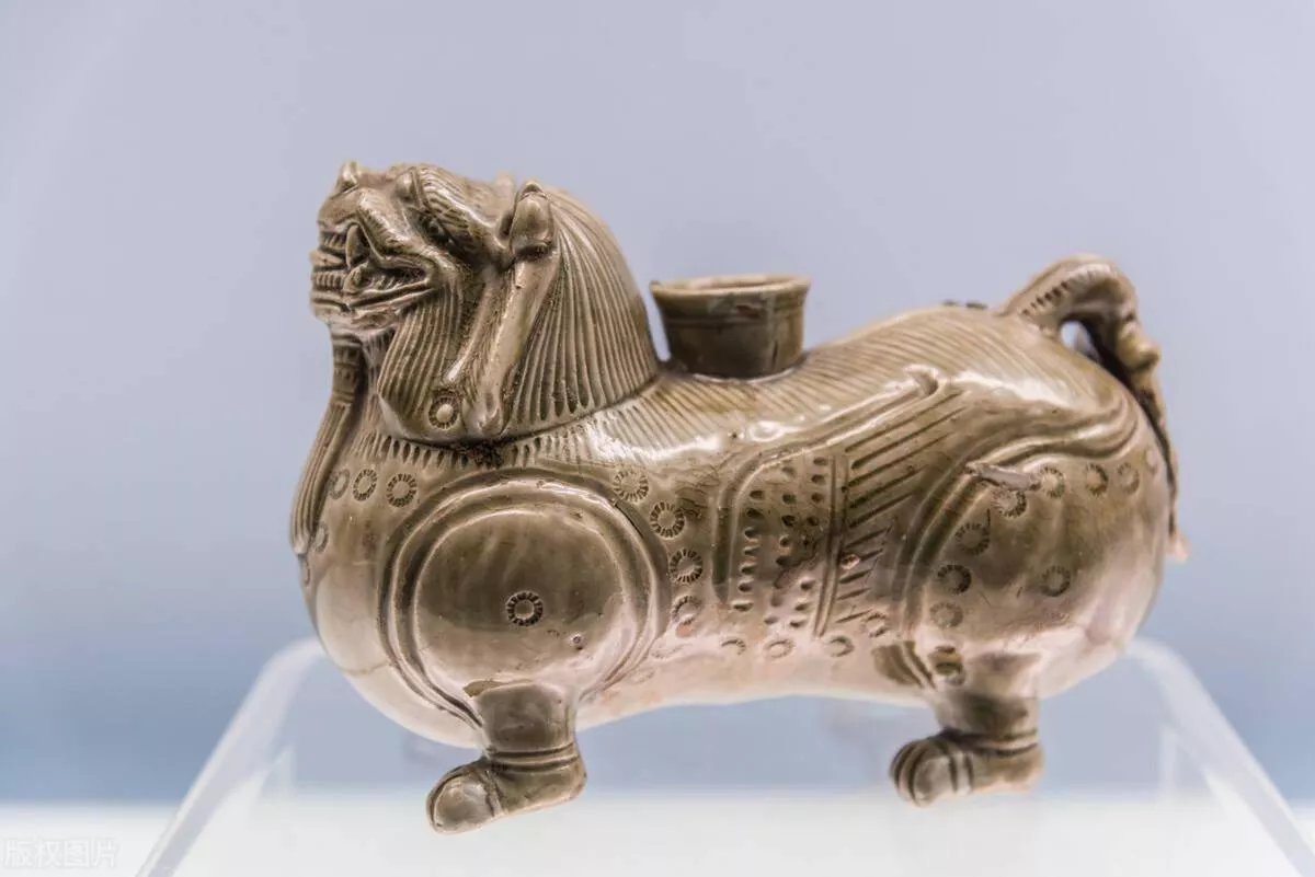 这件青瓷神兽尊,出土于西晋名人周处之父墓,形象生动,神兽口含明珠,头部像狮,可能就是传说中的神兽狻猊。