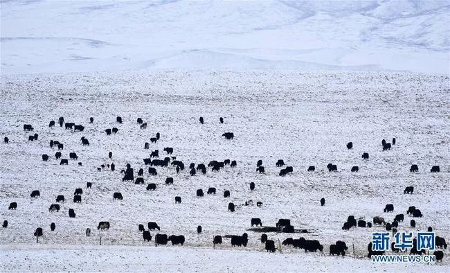 牦牛在雪后的金银滩草原上觅食。当日,位于青海省海北藏族自治州海晏县境内的金银滩草原迎来降雪,雪后的草原银装素裹,牛羊漫步其中,如同一幅画卷。新华社记者 张宏祥 摄