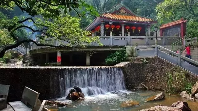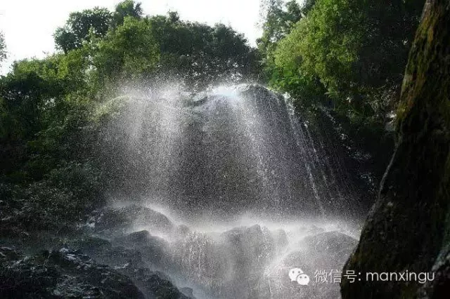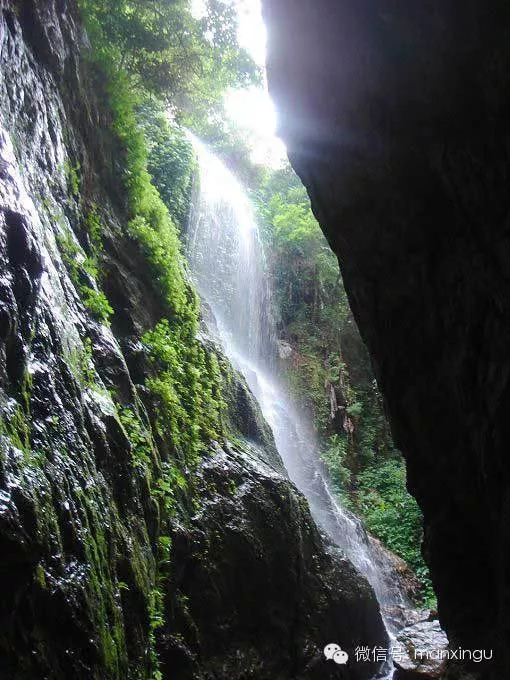 一线天,在长潭入口处右侧,左右两边双峰对峙,峭壁削立,似两把尖刀插入云天,高数百米,一股清泉从两峡中倾泻下来,仿若银带挂珠帘;山腰有一丛美人蕉,似美女婷婷玉立,翩翩起舞迎接游人。抬头仰望,峰际间露出一线蓝天,一线天水从天而降洒成瀑布,飘洒在谷底的千奇百怪的石头上。