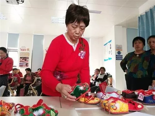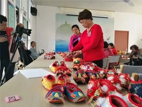 杨老师拿起一等奖的虎头鞋向大家讲解起了细节:“这双虎头鞋的鼻子和普通的不一样,它的鼻子是立起来的,其他的都是平面的。”一番点评说得大家心服口服,表示还要更加努力学习技艺的精髓。