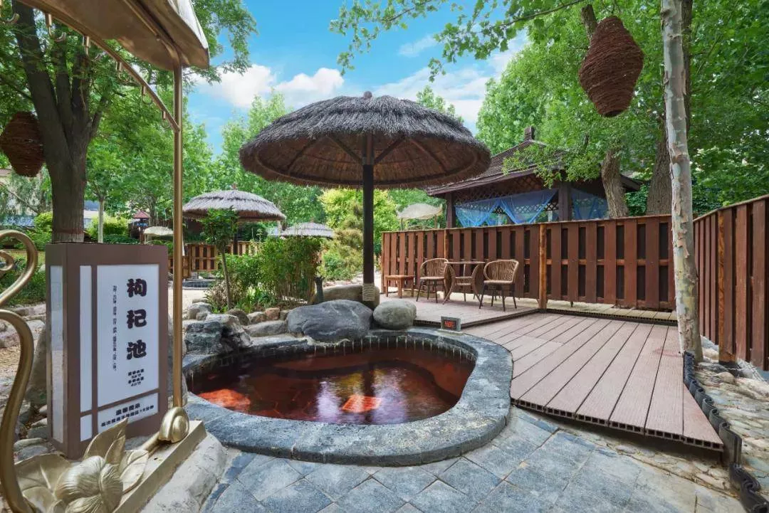 露天温泉区有玫瑰花池,柠檬汤池,牛奶汤池,红酒汤池,艾草汤匙...等38个特色汤匙。