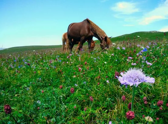 湖蓝的。绚丽香翠地装点着整个原野。从春天金黄的蒲公英盛开到深秋洁白的雪绒花面世,一茬又一茬陆续开放。