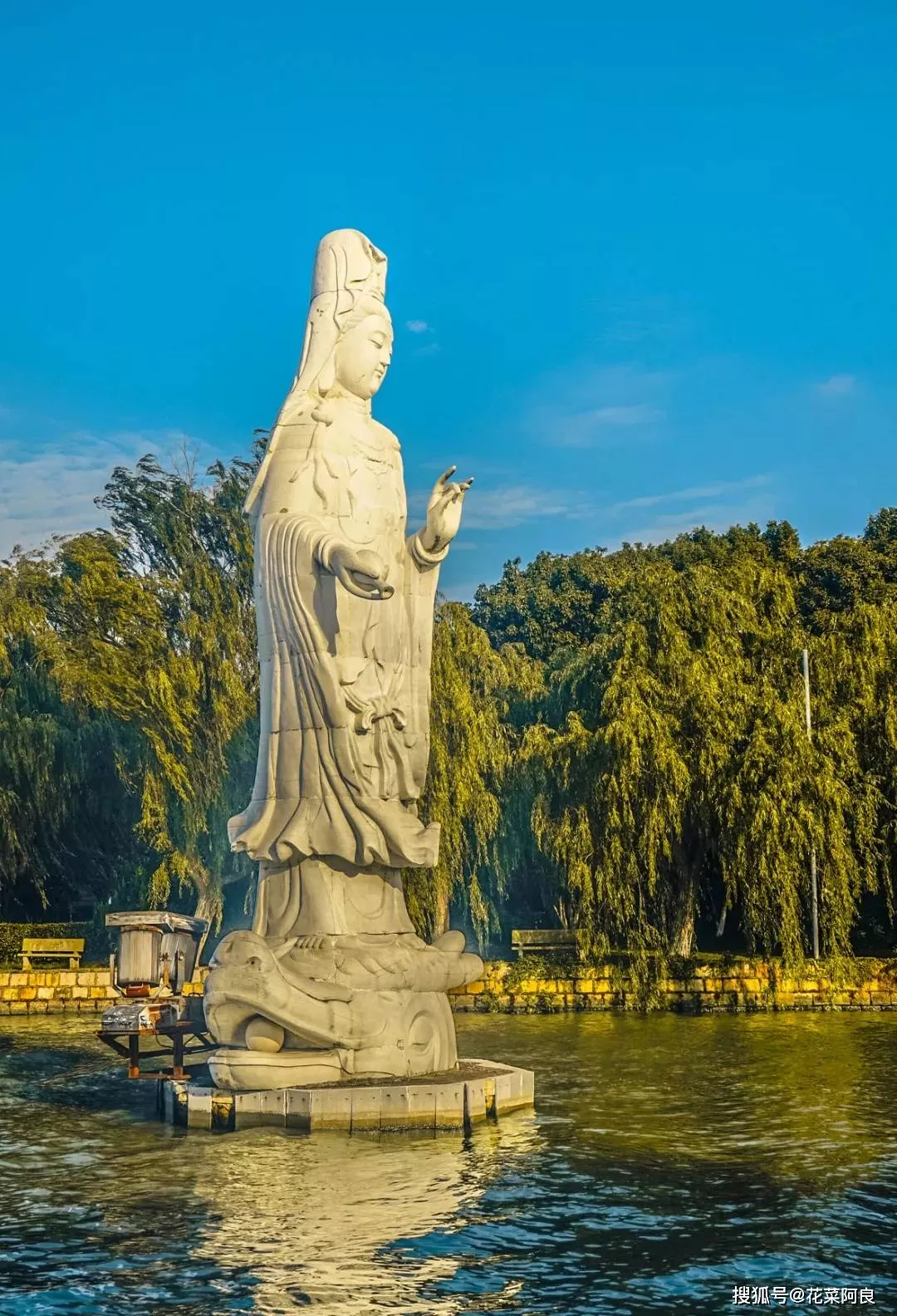 霞屿禅寺东门的湖边上,立有一尊十米高的水月观音,取山东雪花白花岗石雕琢而成,通体雪白。观音手执净瓶,慈祥宁静,眉目低垂,脚踏龙子,以潋滟水色为莲,青山绿意为景,站立于微波的湖水之上。