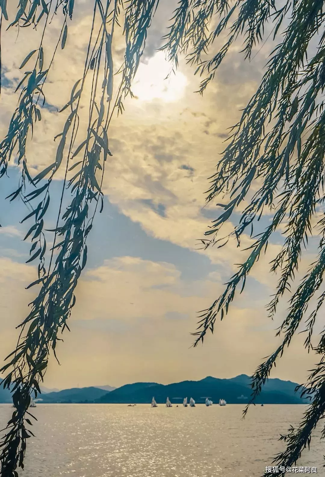 整个湖面山色空濛,万点金光,湖上扬起点点风帆。夕阳照射而下,满眼银光水痕,场景颇为震撼。