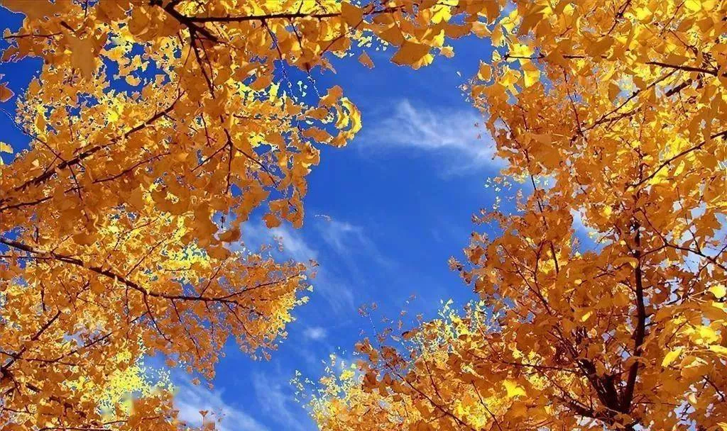 在这里,一排排的银杏树,黄得透彻的银杏叶,撒下了遍地的金黄。秋风一起,株株银杏树仿若唰地一下被点亮。鲜亮的绿叶镶着黄边的,通体黄成一片的,再衬上湛蓝蓝的天,真是明快到人心里去了。