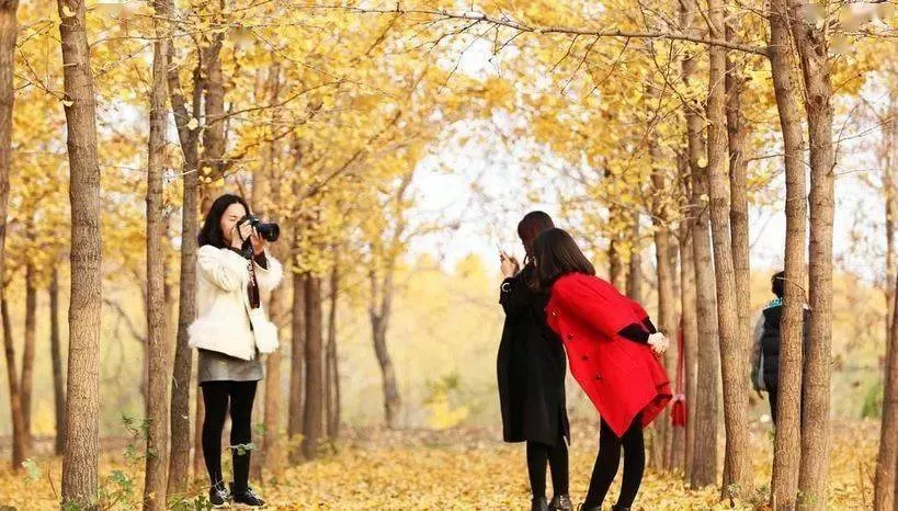目前,成片的银杏叶连成金黄色的盛景,吸引了众多的游客、摄影发烧友前来观光、采风。
