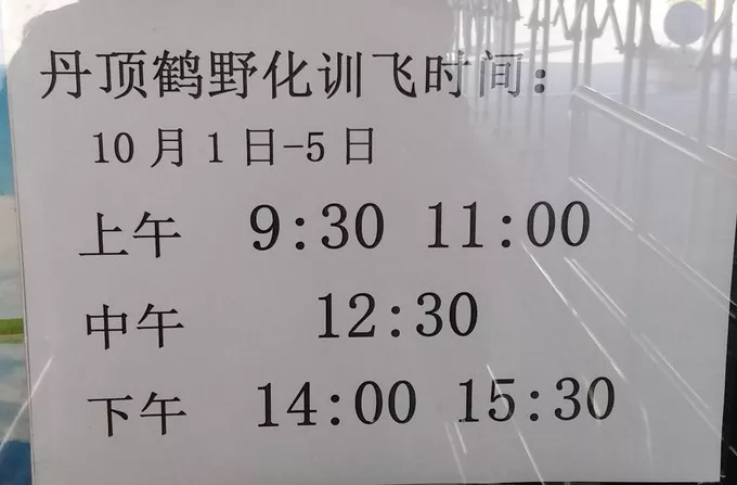 ●每次丹顶鹤放飞分两拨,每拨约20只,每拨飞行时间也就30秒。建议在木板广场稍微靠边的左右两侧等候观看,丹顶鹤一般从左侧起飞,从右侧降落,然后就是在湖面吃点小鱼,每次展示大概不到20分钟的时间。
