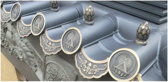 金星铜工程参照古建筑琉璃瓦的形式和功能,专门研制、开发了铜合金仿古琉璃瓦,达到了宏伟、富贵、牢固、防水防风沙等艺术和功能效果。