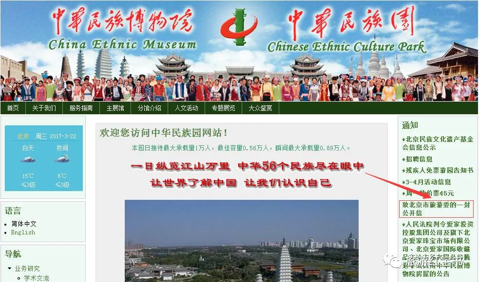12月6日,北京中华民族园在其官网首页发布了《致北京市旅游委的一封公开信》(现已放到右侧通知栏里)。