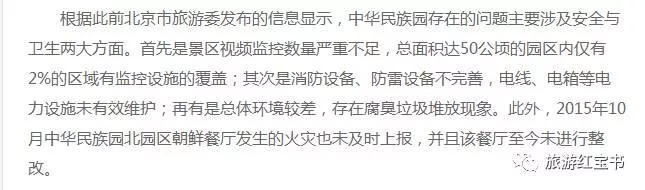 根据此前北京市旅游委发布的信息显示,中华民族园存在的问题主要涉及安全与卫生两大方面。(2017年3月20日,北京商报网报道)