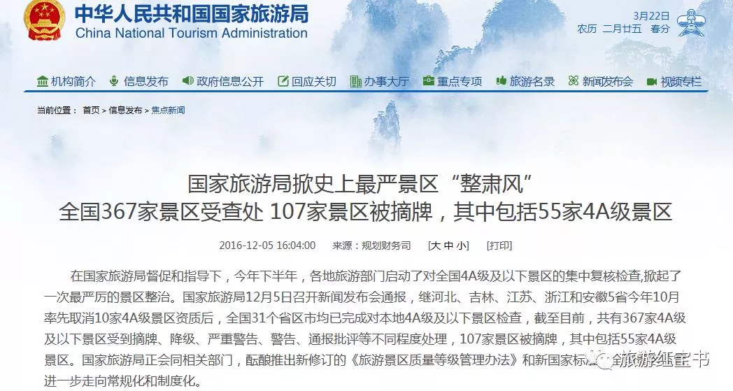2016年12月5日下午,国家旅游局在其官网发布了《国家旅游局掀史上最严景区“整肃风”全国367家景区受查处 107家景区被摘牌,其中包括55家4A级景区》。