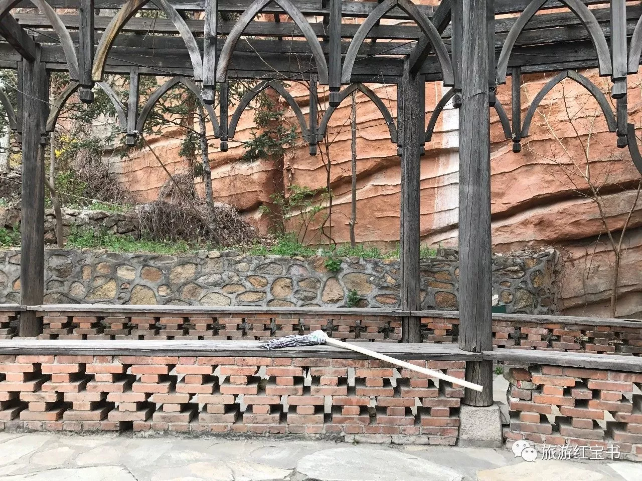 一个拖把遗落在右侧的长石廊上,更增添荒凉,让人误以为这只是一个被主人荒废的院子。
