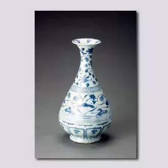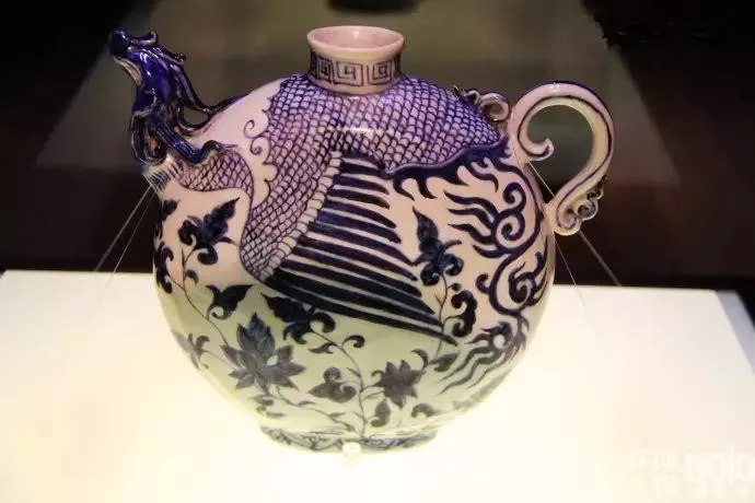 第三件为元代青花凤首扁壶。该壶共两尊,鸾凤(雌雄)各一尊。一为凤,现存新疆伊犁哈萨克自治州博物馆;一为鸾,就藏于首都博物馆。凤首扁壶采用多种制作工艺,壶流采用模制成型,壶柄以手捏塑成型,壶体为雕镶成型法,最后琢成整体。是一件具有很高历史、艺术价值的珍品。