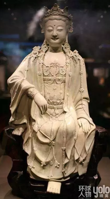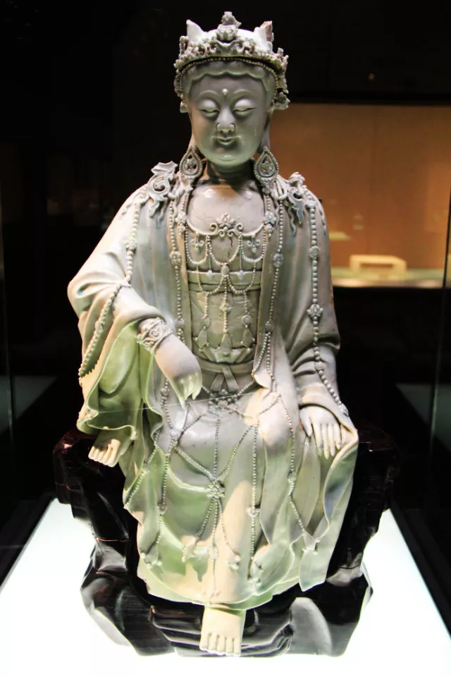 第二件能称镇馆之宝的是元代景德镇窑青白釉水月观音菩萨像。此尊观音菩萨像姿势自然优美,呈观水中月姿势,故称水月观音。水月观音的形象是最早唐代画家周昉根据玄奘大唐西域记中的观自在菩萨创造的造型,体现了元代景德镇高超的瓷塑水平。