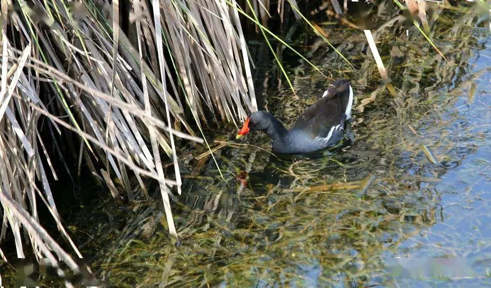 丹江口市大沟林区集镇中心人工湿地吸引至少6只以上的黑水鸡家庭,人工湿地良好生态设置和水中丰富鱼虾等水生物让这个小家庭在这里繁衍生息,娇态可人的雏鸟,捕获鱼虾喂食幼鸟的成鸟吸引游客驻足欣赏。