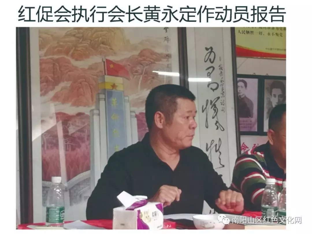 接下来会议由“红促会”执行会长黄永定作动员报告:①详细讲解了建造革命历史纪念馆及千人(多功能)会场的配套构思、目的及意义。力争做到整个南阳山区、甚至全普宁市具备重要影响力的“红色教育基地”;②动员村民让出土地,对用地补偿作出了指导意见;③提出要完善红促会机制建设,特别是完善财务制度问题,做到公正、廉洁、透明、公开,会计、出纳、财监管理人员要配套齐全;④强调烈士纪念碑后壁纪念墙及广场的铺设,在春节前加快速度完成规划并进一步做好图纸方案;⑤要求做好“美丽乡村”人文关系及乡村整洁。⑥要求做好年终总结及新一年的工作计划。