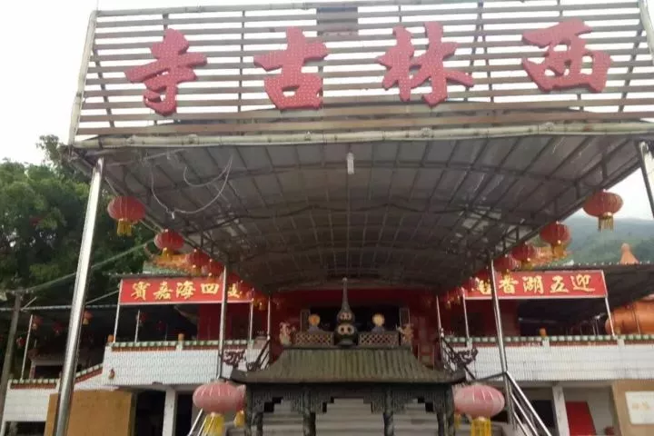 从南阳圩出发,通往西林古寺是一条1.5公里长,5米宽的水泥盘山公路,到达一个大型停车场后,就看到西林古寺的全貌了。沿着86级石阶拾级而上,走到石阶尽头,来到古寺拜亭前面,正中亭楼上,“西林古寺”四个镶边红色大字映入眼帘,两侧则是一副横写楹联:“迎五湖香客”“接四海嘉宾”。
