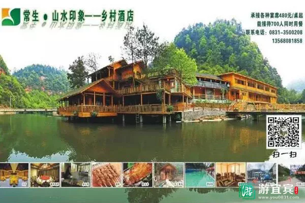 常生·山水印象——乡村酒店 位于宜宾市思坡乡会诗沟,是一家集观光、休闲、度假、垂钓、餐饮、住宿为一体的乡村酒店。设有餐饮包间、宴会厅、会议室、休闲茶园、农家柴火鸡、客房住宿、休闲机麻、游泳、自助烧烤等,可同时容纳1000人用餐。大厅目前可同时容纳60桌客人同时用餐,餐厅配置有高档音箱、话筒、投影仪,饭后可根据自己的喜好再高歌几首,另分别配置有雅间一桌分别同时可坐24人、14人、12人、10人等用餐。