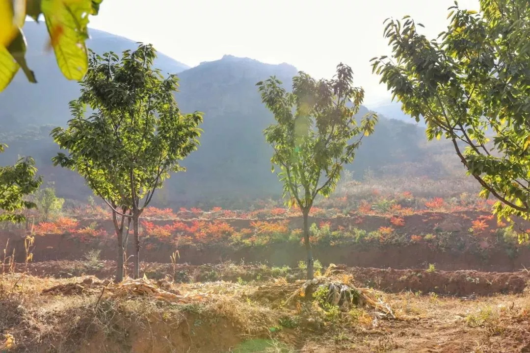 总觉得秋天的色彩是最丰富深刻的,秋风晕染出的渐变不仅斑斓,更妩媚。漫山遍野的火炬树似一面面旗帜点亮着视线,而那些叶子还葱绿的核桃树,五彩斑斓的安梨树却散落山腰。秋草的枯败,红叶的热烈,山峰的肃穆一股脑汇聚着,生动了这个秋天。