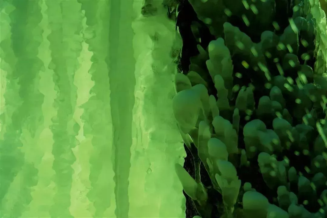 这里的水量小,面积宽,所以呈片状。再加上这里的植被比较丰富,所以晶莹剔透的冰瀑下面还能看到一点点隐隐约约的绿色。