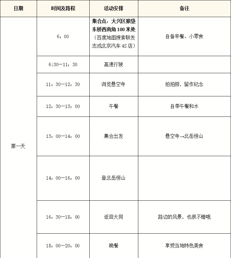 集合地点:6:00在北京市大兴区狼垡东桥西南角100米处(地图搜北京汽车联发志成4S店)集合