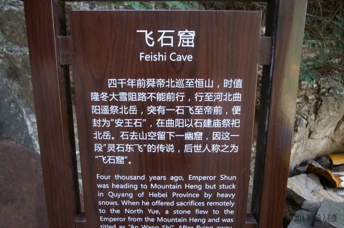 传说灵石从飞石窟飞落在舜帝面前从这里仰望,恒山主峰上的大小祠庙已经看得清清楚楚。沿着林荫曲径,回身攀石阶抵达飞石峰绝壁腰际的一个天然大石窟前。只见约200平方米的洞内,好像是一个方形院落,三面环壁,一面临崖,这个飞石窟,就是恒山十八景之首的“幽窟飞石”。