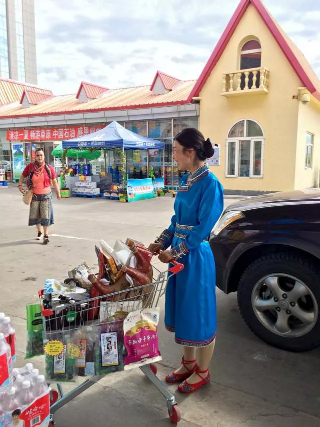 身着蒙古族服装的加油站员工然而在蒙语中“霍林”意为美食,“郭勒”是河的意思, “霍林郭勒”即为美食之河,这倒是让人颇感意外,更意 的是我们在霍林河有幸吃到了口感令人难忘的涮羊肉,真不愧为蒙古草原上的美食之城。