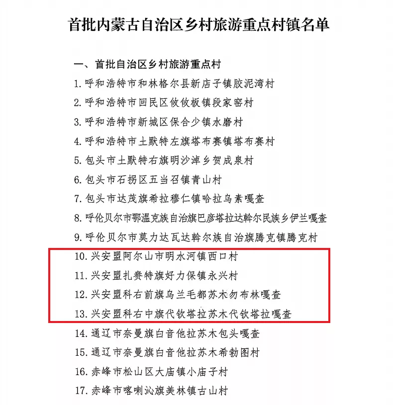 兴安盟共有4个村(嘎查)入选首批内蒙古自治区乡村旅游重点村,分别是阿尔山市明水河镇西口村、扎赉特旗好力保镇永兴村、科右前旗乌兰毛都苏木勿布林嘎查、科右中旗代钦塔拉苏木代钦塔拉嘎查。