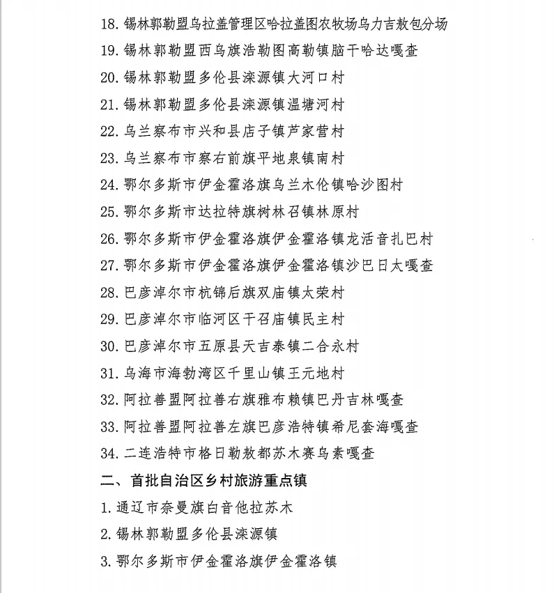 在各地遴选推荐的基础上,经专家评审和公示等程序,自治区文化和旅游厅、自治区发展改革委决定认定呼和浩特市和林格尔县新店子镇胶泥湾村等34个村为首批内蒙古自治区乡村旅游重点村,通辽市奈曼旗白音他拉苏木等3个乡镇为首批内蒙古自治区乡村旅游重点镇,并与我区24个全国乡村旅游重点村共同列入内蒙古自治区乡村旅游重点村名录。