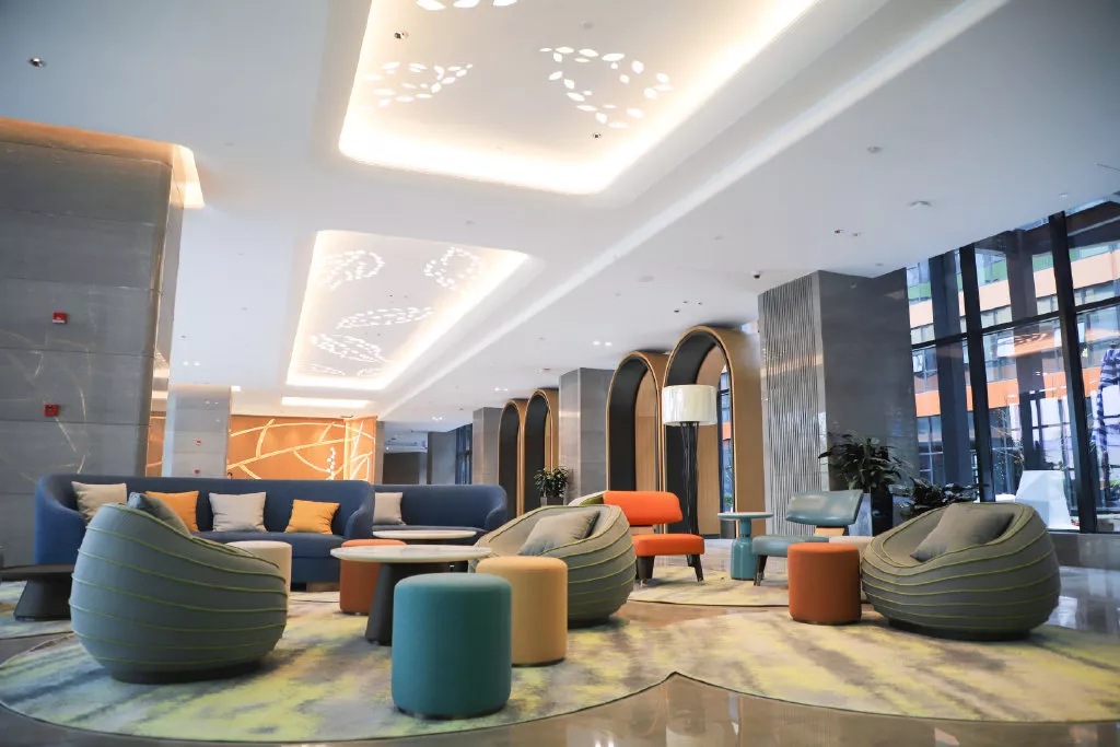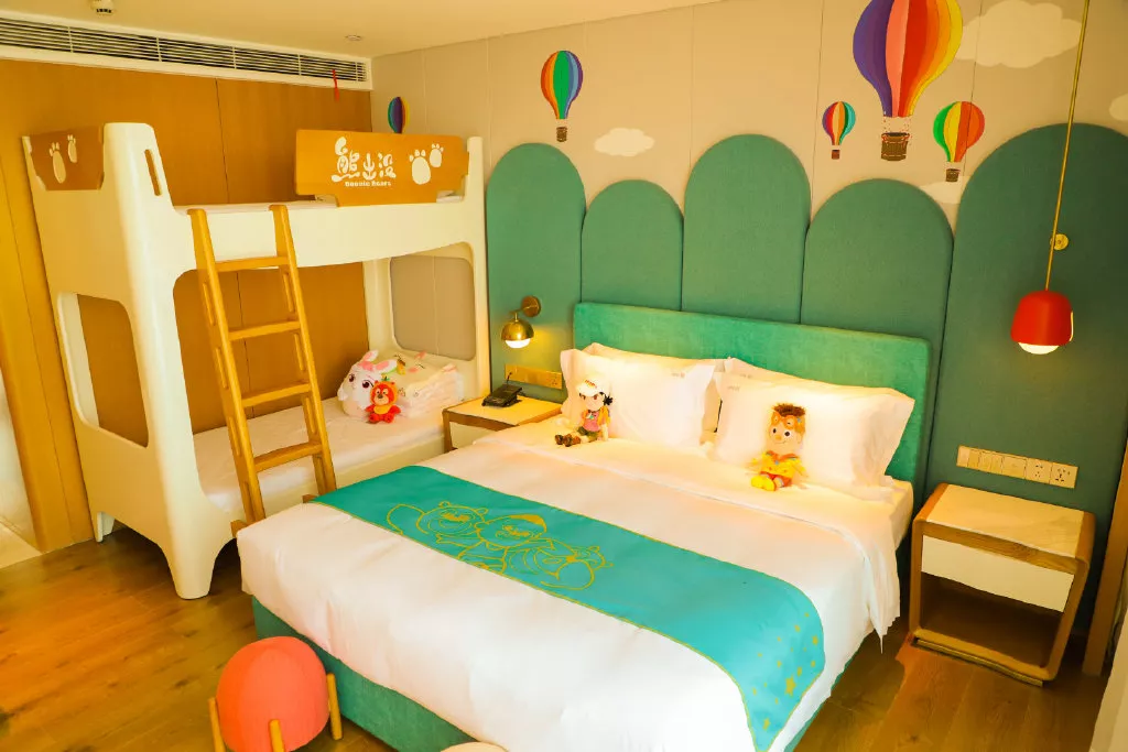 紧邻无边泳池的七彩建筑就是全球独家的熊出没酒店。酒店大堂典雅大气,客房却童趣十足,随处可见熊大熊二的身影。甚至还有供小朋友玩闹的熊出没游乐空间。