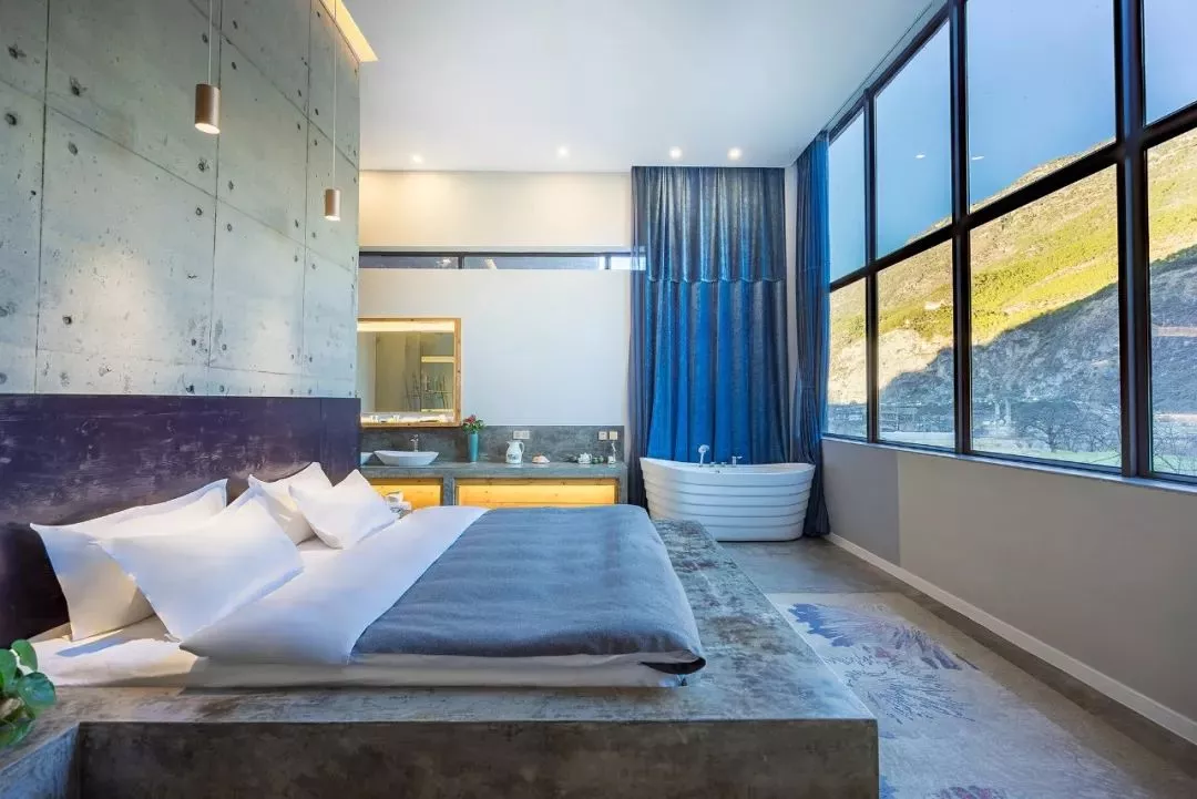 房间风格除了复古雅致,也有后工业风的时尚新潮,但不管哪种房型,都有大落地窗正对美景,躺在床上便可看到窗外的水光山色。