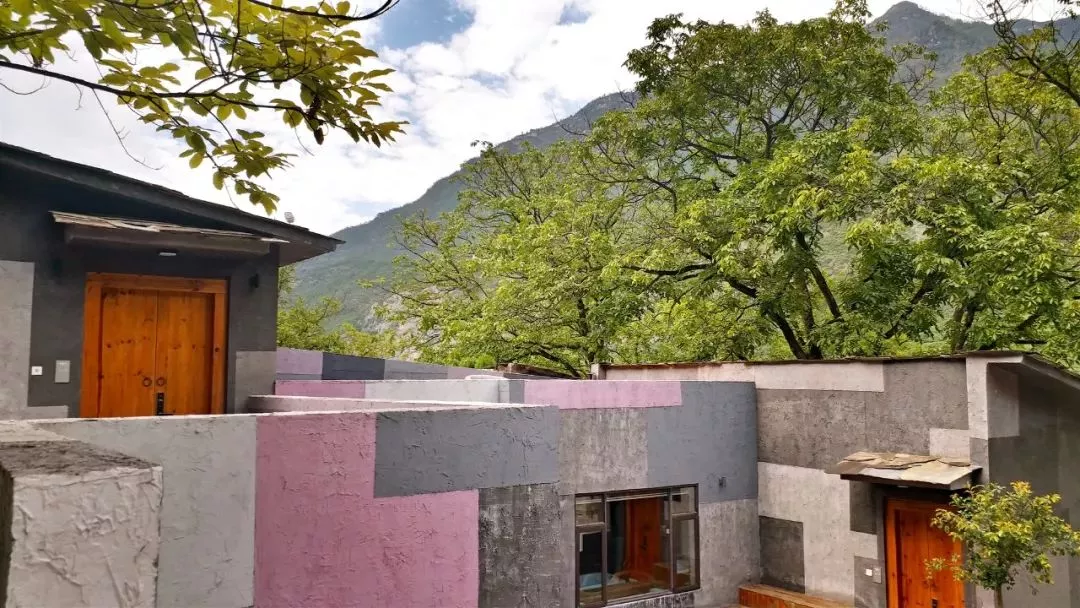 民宿被十几棵千年古核桃树包裹着,但走近一看,艺术感的造型和用色,让人想到网红建筑“西班牙的红墙”,在这拍照分分钟就是大片的节奏。