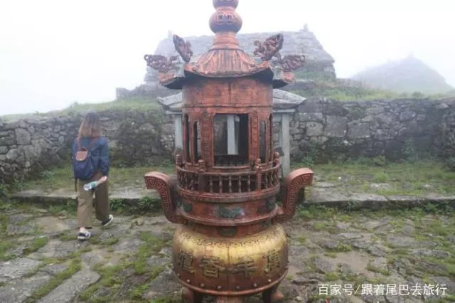 越往上爬云雾越大,站在山上看着这虚无缥缈的云雾真的有种得道升仙的感觉。快到山顶的时候,我们在一个亭子里休息,吃着带来的各种食物。在亭子里看着这漫无边际的草甸,虚无缥缈的云雾,连绵不绝的山岚简直美极了。在金顶上有一块石碑还有一块日冕,上书着武功山海拔1918.3米。