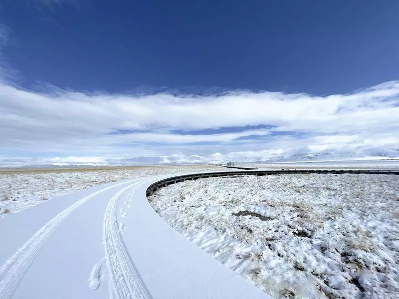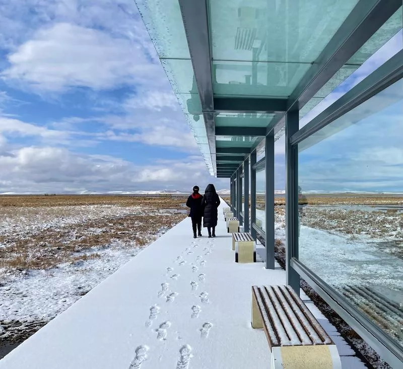 早上打开房门,外面竟然下起了大雪,纷纷扬扬,飘飘洒洒,奔驰在下雪的草原上,银白广袤,雪原茫茫,到达花湖时,雪停了,天也晴了,蓝天白云雪山,白雪覆盖的花湖,展现出另一种色彩和美丽。