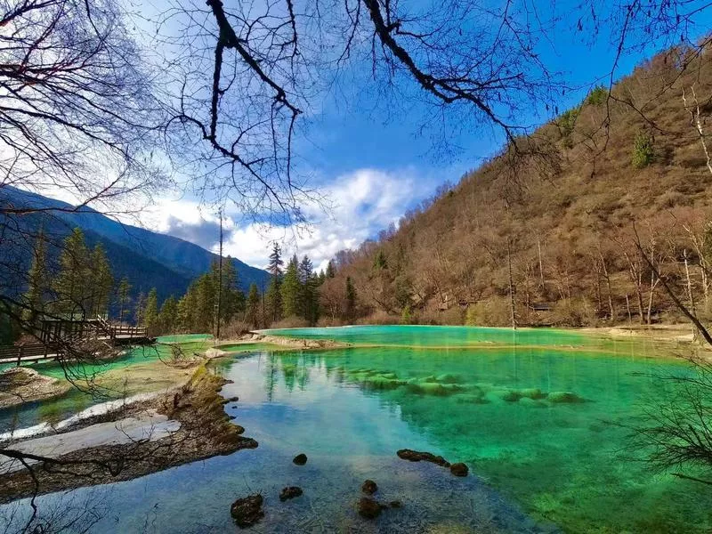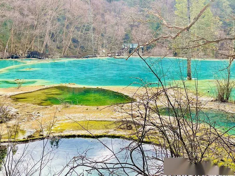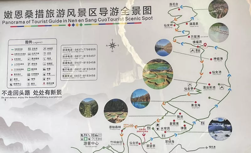 嫩恩桑措最特别之处在于它是目前世界上为数不多的,能同时看见高山湖泊和钙化彩池的景区。而且这两种地质形态呈交替套迭分布,在阳光的照射下,海子像锁进了虬枝的绿色宝石、钙化池像布满裙边的玉盏金莲。两种美景互相映衬、次第铺开,最终呈现在我们面前的就是一个图影交错的童话世界,一个袖珍玲珑的世外仙境。