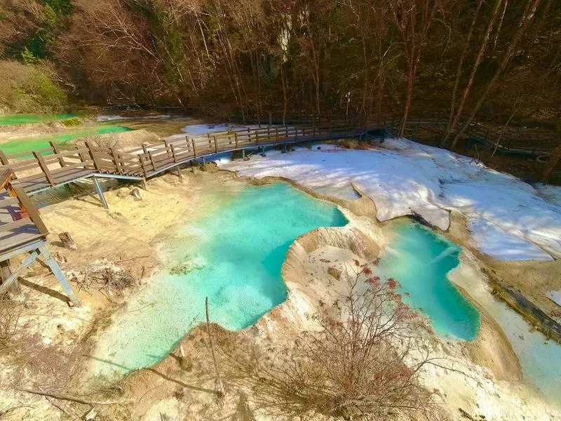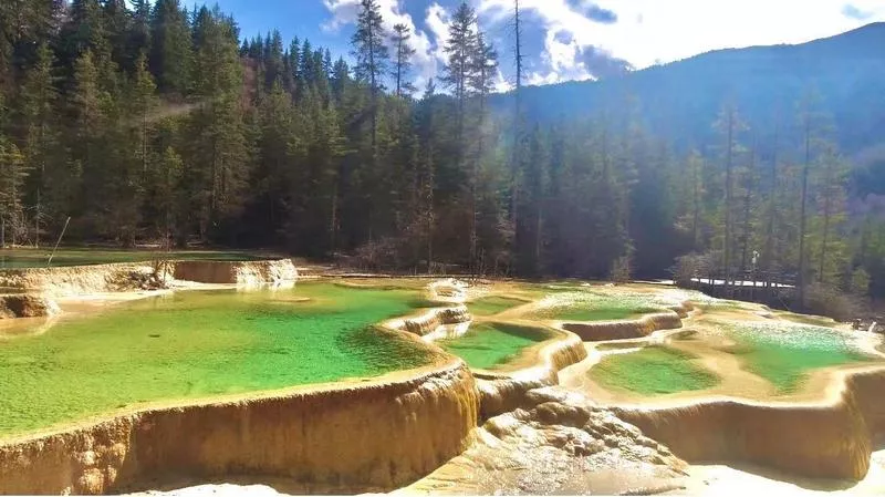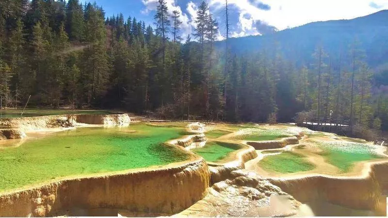 徜徉在神仙池畔,一汪碧水映入眼帘,忽然觉得所有的辞藻在这片仙女沐浴过的海子里都变得苍白无力了。钙化了的池水像凝固着的琼浆玉液,梯田般层层错落,一水连一水,在阳光下洁净无尘,流光溢彩,兀自静悄悄地美丽着。在静谧如世外桃源的原始森林中,这些池水好似散落在高山上的碧玉,仿佛是几千年都不曾有人来过的地方。看点